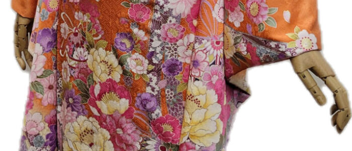 桜・牡丹・菊といった四季の花々が重なり合いながら咲き誇る様は、まるで花園のような美しさ。白・ピンク・紫を中心とした彩りがオレンジの地に映え、甘やかさと格調のある華やぎを同時に感じさせてくれます。